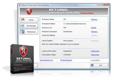 Returnil Virtual System Premium 2008 protege o sistema operacional Windows contra ataques de vírus e instalação de spyware. Ele limpa automaticamente todos os seus rastros de atividades na eeb e histórico de navegação. Esta tecnologia cria uma “cópia” do seu sistema Windows quando inicializado (boot).Se a proteção estiver ativa, o seu sistema estará rodando uma partição “clonada”. Mas toda alteração na partição do sistema será perdida depois da reinicialização (reboot). Caso a proteção esteja inativa, você poderá instalar novos softwares e fazer qualquer remoção normalmente. Assim, todas as alterações serão salvas.